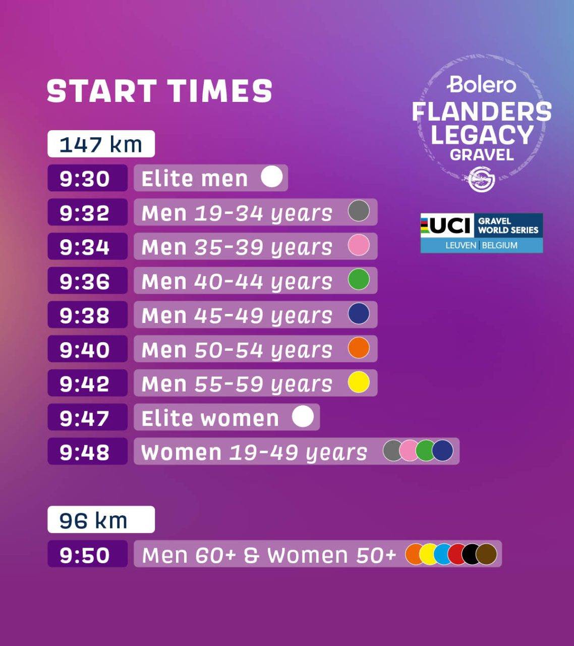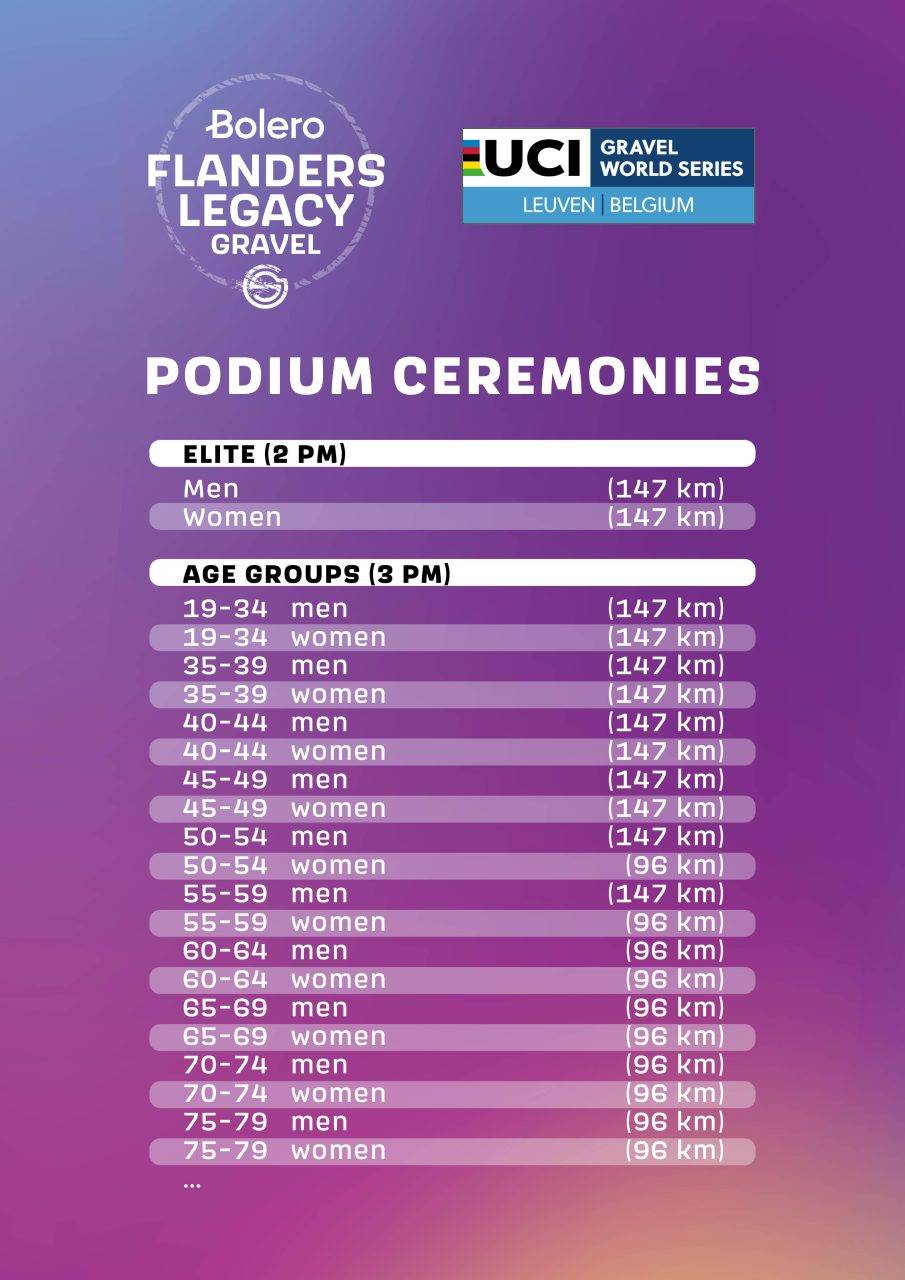 The top three in each category will be invited to the podium ceremonies. The timing of the podium ceremonies for Flanders Legacy Gravel can be found below. There will be a designated waiting area at the finish line where all podium winners can prepare for the ceremony.